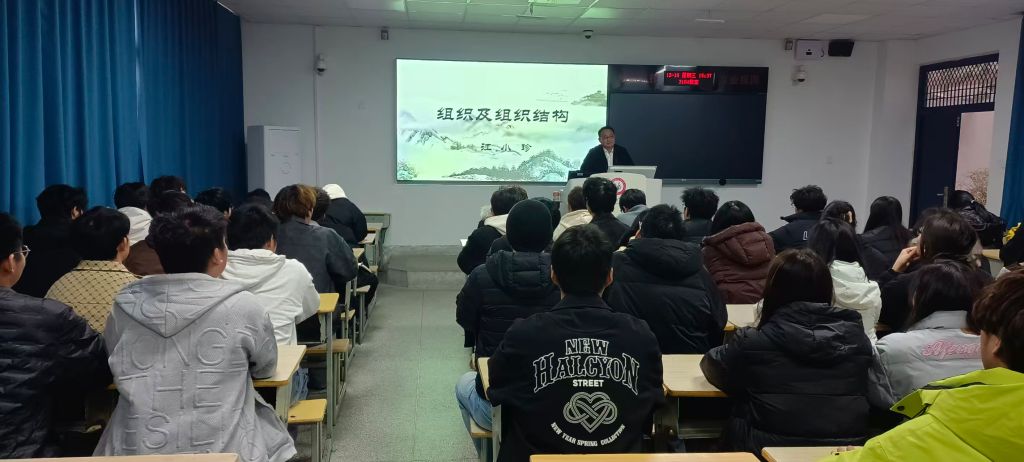 讲座中,江小珍教授将内容划分为两大核心模块,层层递进地为同学们展开讲解。第一模块聚焦组织基础认知,他从组织的定义切入,深入剖析了组织存在的核心理由,细致梳理了组织内部的各类关系,并结合实际案例解读了组织运行过程中可能面临的不确定性,帮助同学们搭建起对组织的基础认知框架。第二模块则围绕组织结构展开,江教授系统阐释了组织结构的定义与核心关系,详解其在组织运行中的关键功效,同时对组织内部的责任与权利划分原则进行了深度解读,让同学们清晰掌握了组织结构搭建的底层逻辑。
